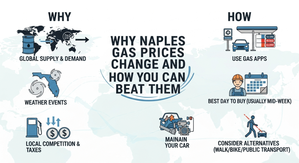 Naples gas prices change because of many reasons. Oil prices in the world can go up or down, local taxes may change, and sometimes weather or traffic affects fuel delivery. Even small changes can make your gas cost more. To beat high prices, check apps, plan trips carefully, and fill up when prices are low. Avoid filling your tank during busy holidays or rush hours, because prices often rise. Using loyalty programs and looking for deals can also help. Smart drivers watch trends over time, like how prices change by week or month. By learning why Naples gas prices change, you can save money and avoid paying extra at the pump.